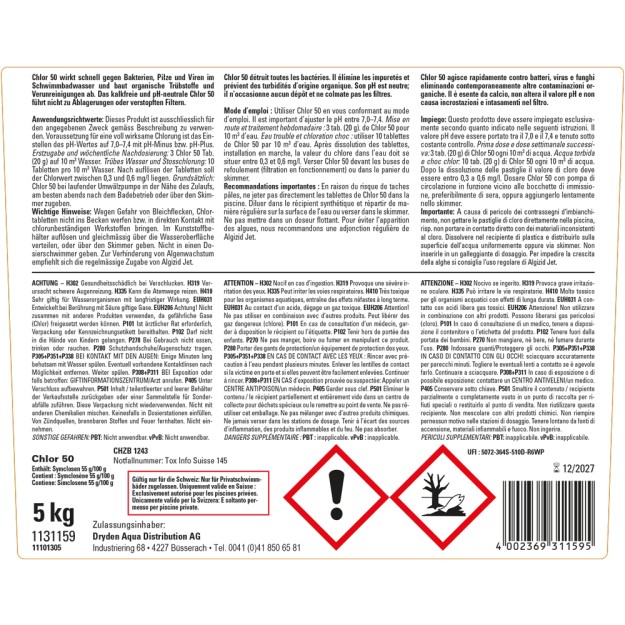 Chlor 50 wirkt schnell gegen Bakterien, Pilze und Viren. Kalkfrei und pH-neutral. Verhütet den vorzeitigen Chlorabbau durch Sonnenlicht, Gebinde: 2,5 Kg